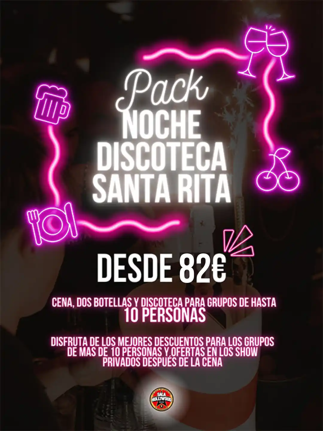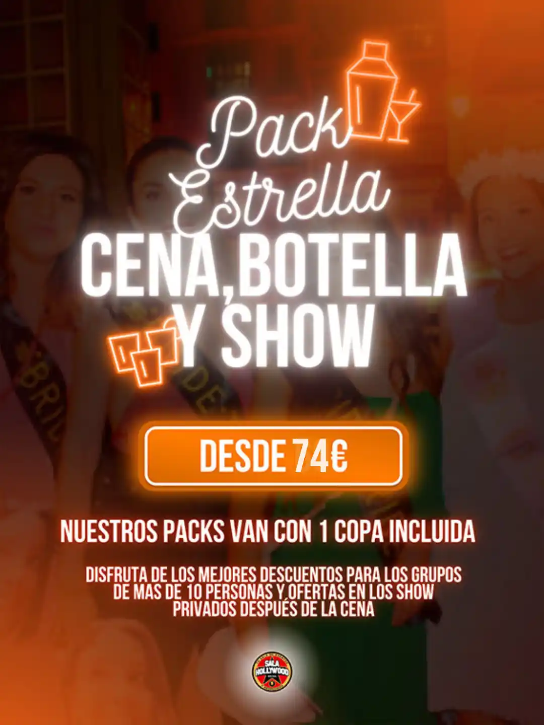 Increíble cena en la Sala Hollywood con mucha animación y bebidas incluidas durante la cena. Barra libre. Show Stripper privado + Botella en reservado (Brugal, Cutty Shark, Bombay, Vozka, Beluga Premium). Grupos de 10 personas
