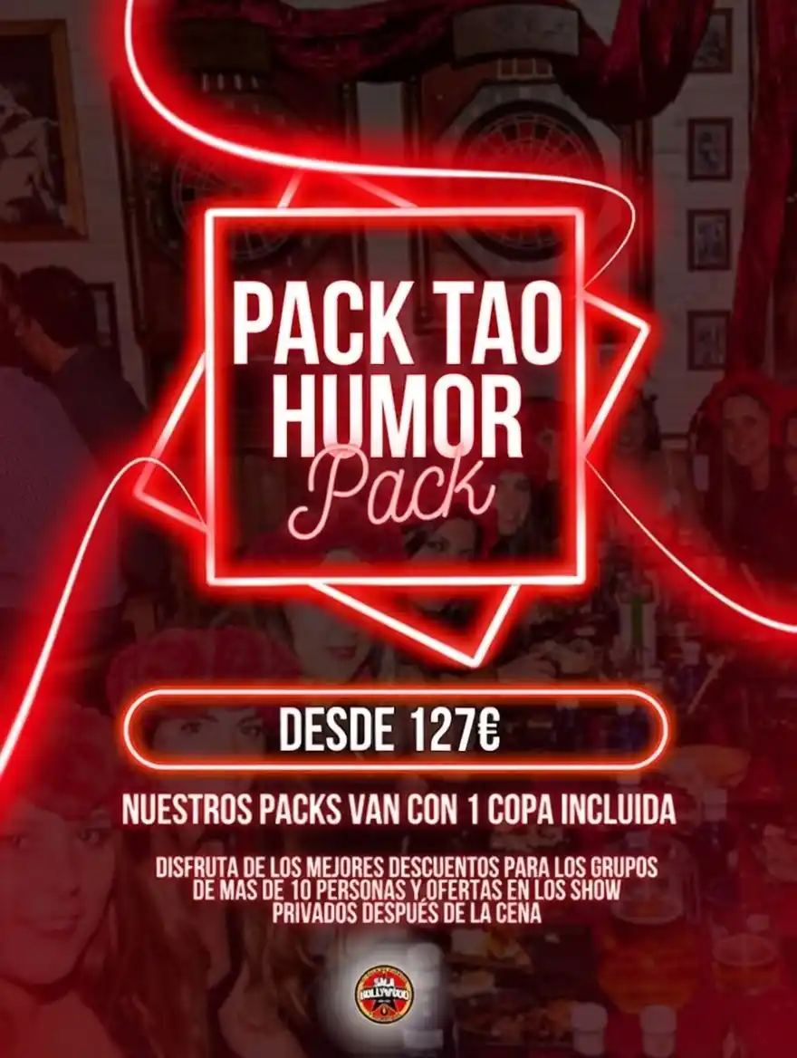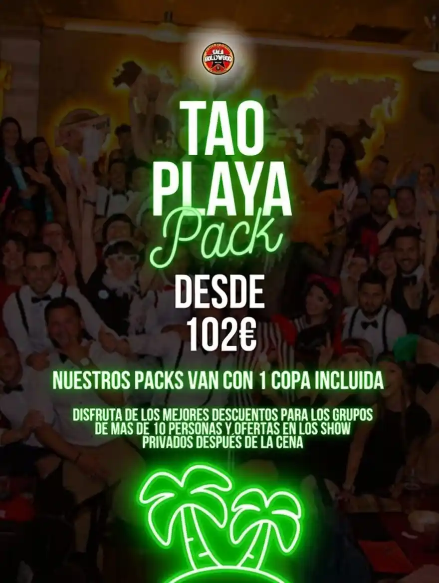 Pasa un día perfecto en Tao Playa y por la noche disfruta de todo lo que tiene para ofrecerte la Sala Hollywood. Animación, muchísimas risas y diversión. Grupos de 10 personas. Menú a consultar.
